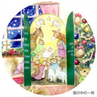窓を開くと聖書に沿ったリスの降誕劇のイラストがみことばとともに描かれています。